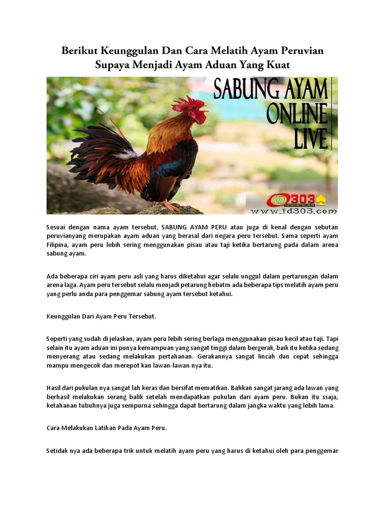 Mari kita simak penjelasan agen sabung ayam. Permainan sabung ayam peru disebut juga sebagai berlaga ayam. Di salah satu cerita rakyat, seorang pangeran bermain laga ayam dan bertemu ayahnya yang telah membuang ibunya. Sambung ayam di peru, permainan taruhan sabung ayam online melalui www.sabong.pw menjadi games seru jika bermain di negara peru yang merupakan salah satu negara di benua amerika selatan.peru memiliki ibukota lima, ingin tahu permainan seru dan menarik di peru. Ayam peru akan semakin ganas dalam pertarungannya apabila dilatih dengan rutin dan teratur.